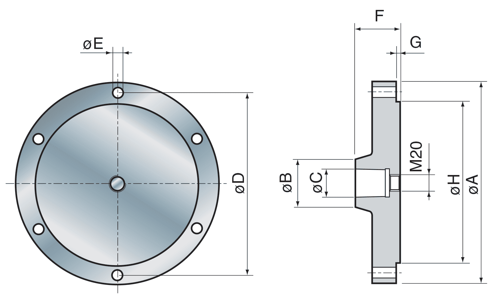 Flange for Din 6350 chuck coupling to be coupled to truncated cone dead or live centres. Anchoring by simply pressing of the head on the live centre. For working of pipes and hollow bodies from ø mm. 45 to ø mm 600.