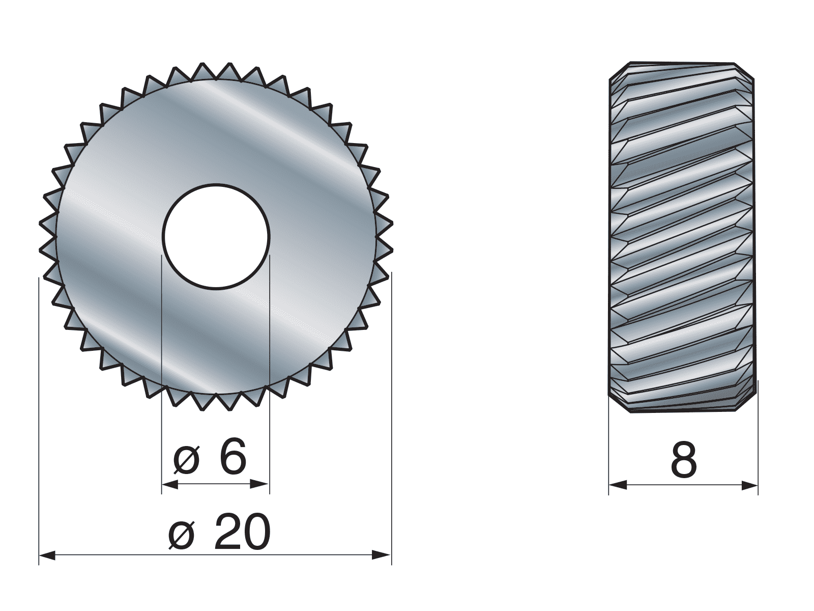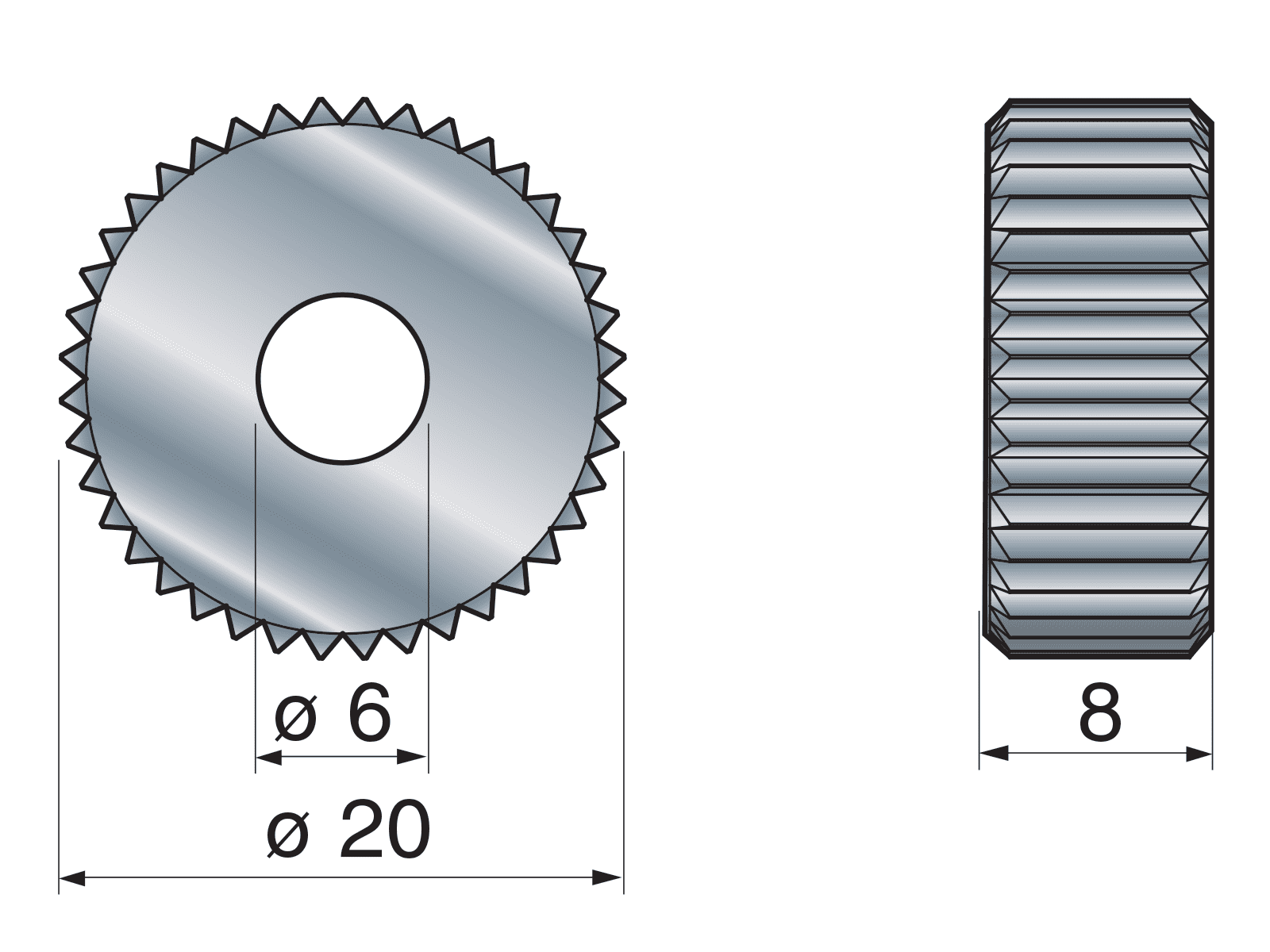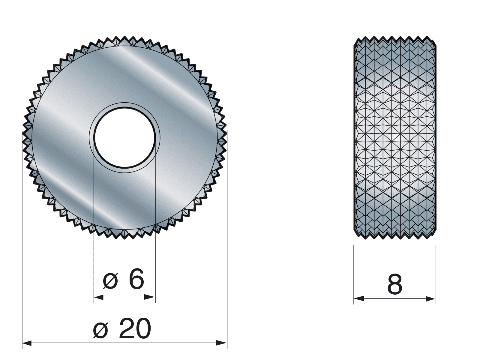 Recess knurling wheels Ø20x8x6 made of special steel with ground profile.