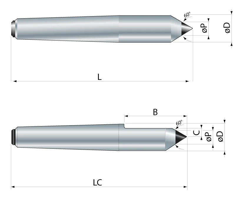 Contropunta fissa prolungata temprata e rettificata e in metallo duro, intera e tagliata.